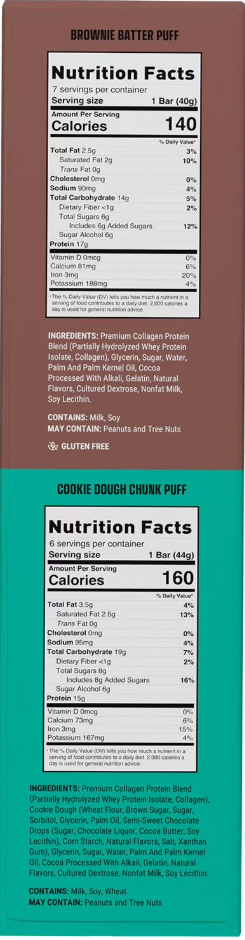 - 15–17 g protein per bar — whey + collagen blend