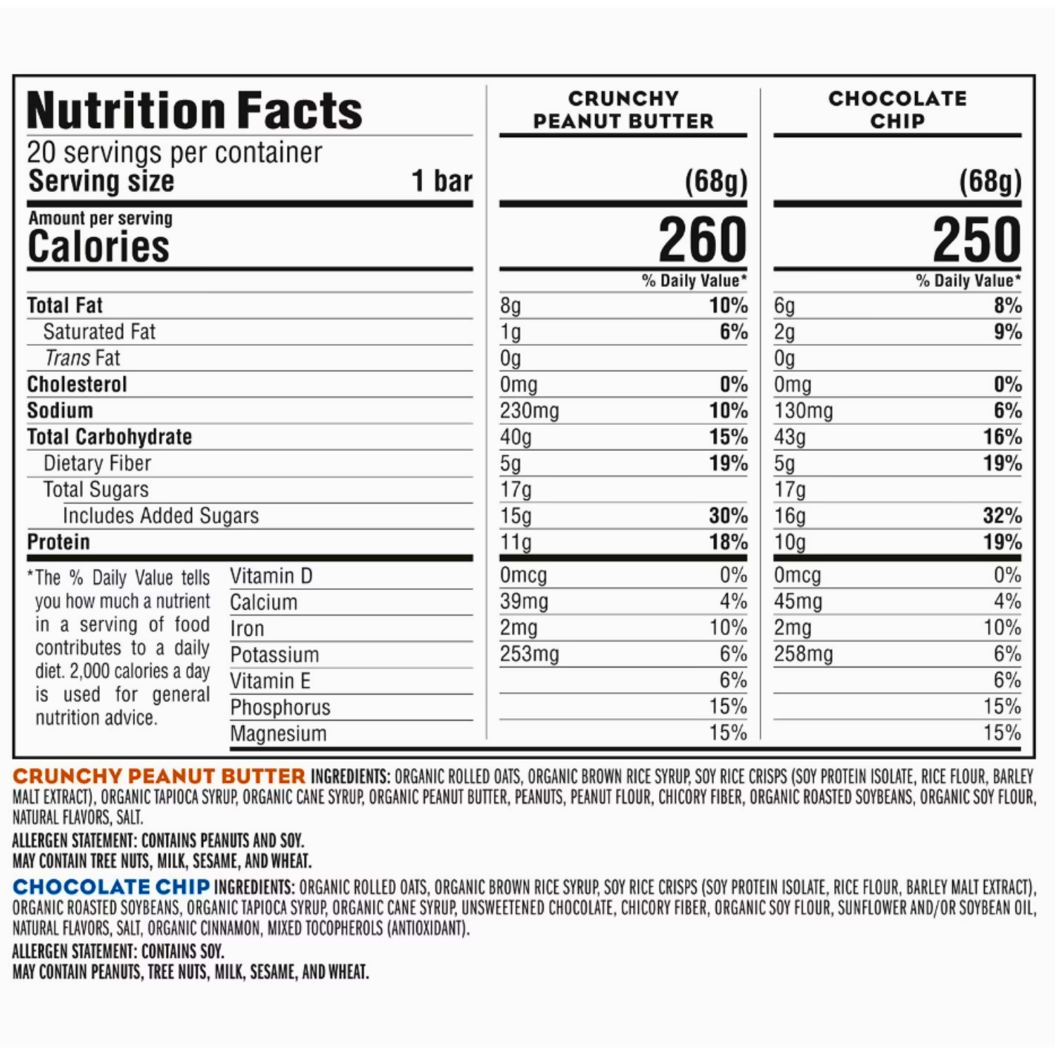 - Total Bars: 20 bars (10 Chocolate Chip + 10 Crunchy Peanut Butter)