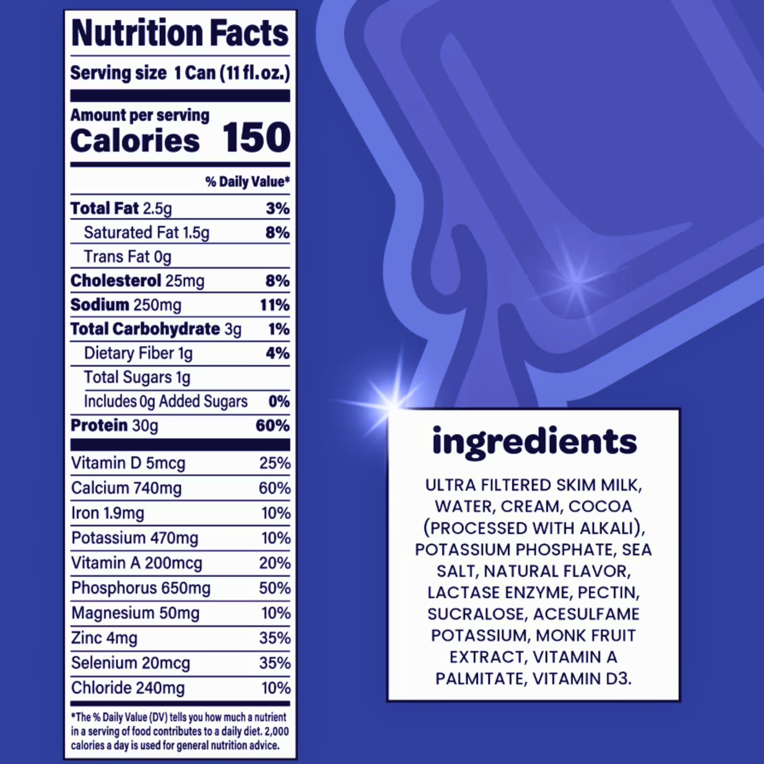 Made with ultra-filtered milk protein, cocoa processed with alkali, natural flavor, vitamins and minerals. See the Nutrition Facts image for full details. :contentReference[oaicite:5]{index=5}