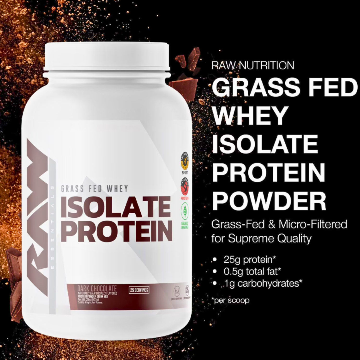 RAW Whey Isolate Protein Powder – Dark Chocolate | Grass-Fed, 25 Servings